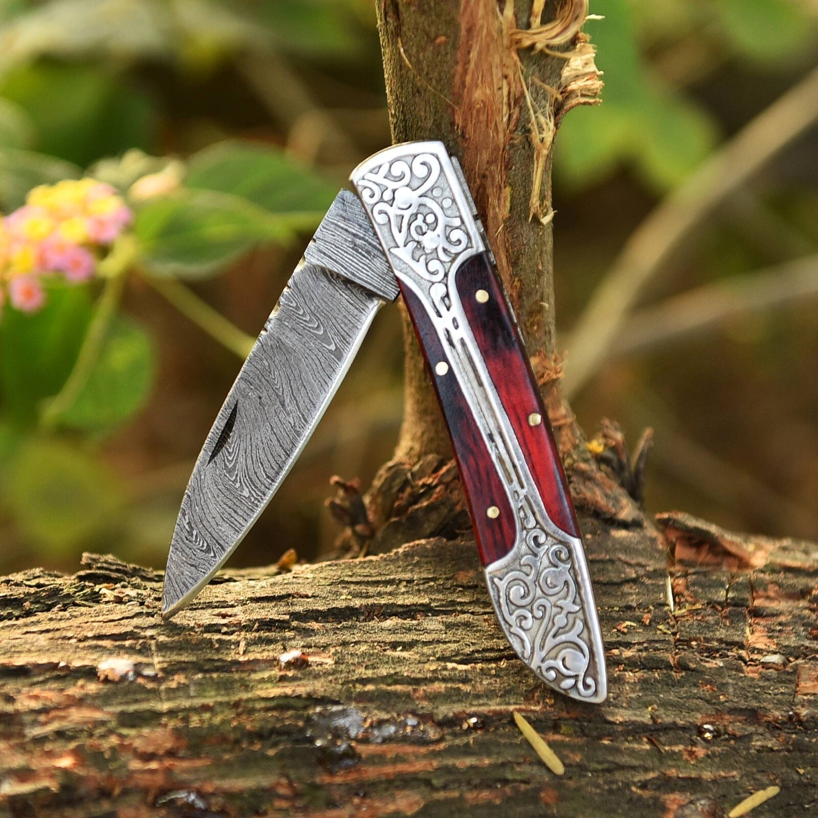 This handmade folding knife combines bold style with practical craftsmanship. Featuring a vibrant red handle with a contoured grip and a beautifully engraved steel blade, it’s designed to be both functional and visually striking. Measuring approximately 6 to 7 inches in total length, this compact knife is easy to carry yet durable enough for everyday use. The detailed blade etching adds artisanal character, making it a standout piece for collectors, outdoorsmen, or those who appreciate handcrafted tools. Complete with a fitted leather sheath and sharpening rod, it arrives ready for daily carry, camping trips, or display. Whether added to a picnic set, paired with charcuterie boards, or included in rustic kitchen accessories, this knife brings a perfect balance of utility and design. A versatile choice for EDC, gifting, or enhancing a collection with unique craftsmanship and bold detail.